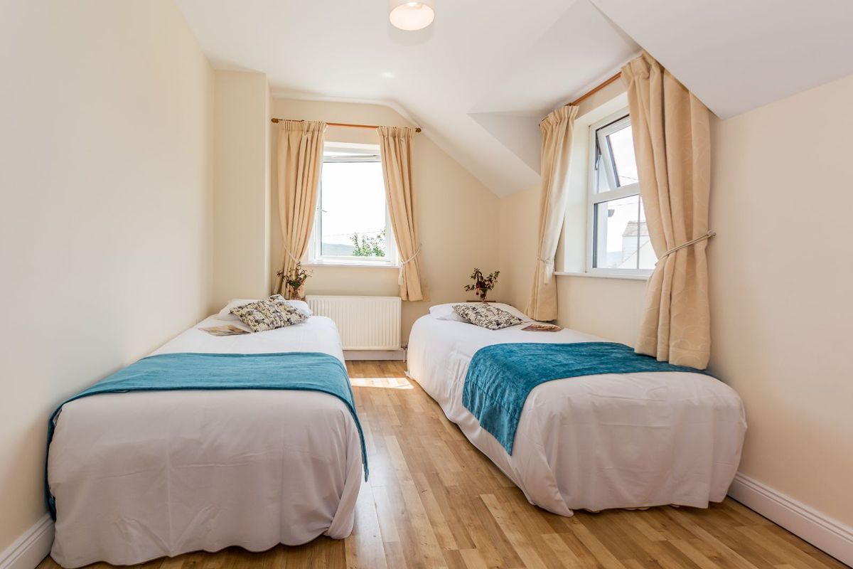 BEDROOM 3:ย ย ย 13’00; x 8’10. Twin bedroom.ย Laminate wooden flooring.ย Two beds.ย ย 2 lockers and a dressing table.ย ย Three lots of twin plugs.ย Two windows, one to the front with views of Castletownbere harbour and the second window with views of the rolling countryside.ย 1 radiator.